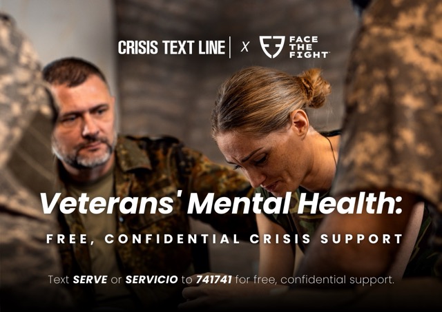 Crisis Text Line partners with Face the Fight to support the military community. If you’re a veteran, active duty service member, family member, or caregiver going through a tough time, help is just a text away. Text SERVE or SERVICIO to 741741 for 24/7, free, confidential and non-judgemental support in English and Spanish, because no one should face a mental health crisis alone.