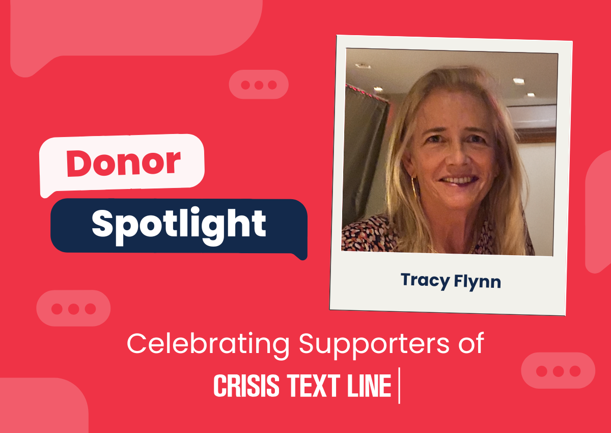 At Crisis Text Line, the generosity of our donors is what helps us continue to save and transform lives. One such donor, Tracy Flynn, who is also a volunteer Crisis Counselor, provides both her time and philanthropy as a way to take action and help those who are experiencing mental health crises. This month, we’re honored to recognize Tracy for her dedication as a donor and volunteer, and for joining us in our goal to ensure that no one has to feel alone in their darkest moments.