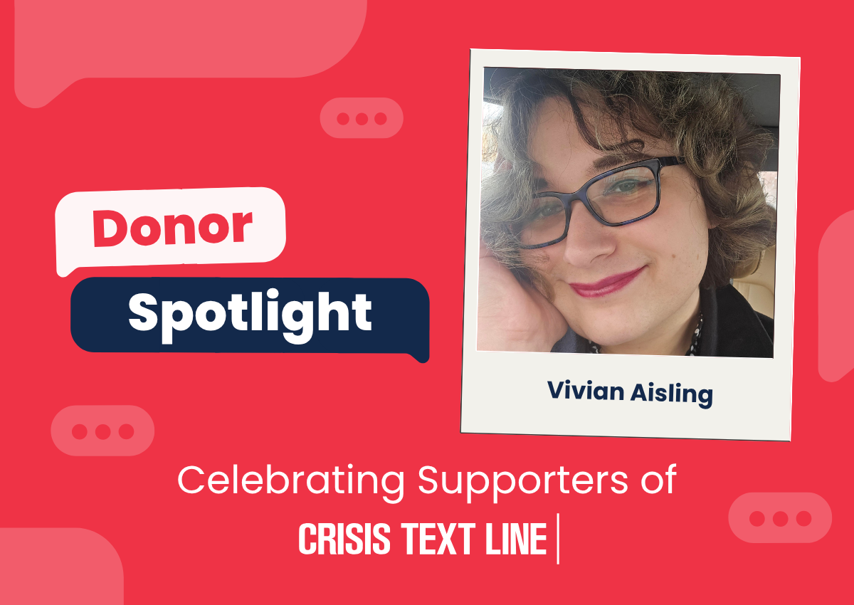 At Crisis Text Line, the generosity of our donors is what helps us continue to be a lifeline for others. One such donor, Vivian Aisling, supports us as a way to take action and support those who are experiencing mental health crises. This month, we’re honored to recognize Vivian for joining us– both as a current donor and previous volunteer Crisis Counselor– in our mission to ensure that no one has to face their darkest moments alone.