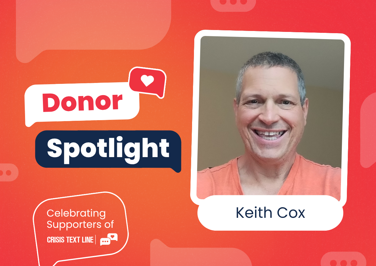 At Crisis Text Line, the generosity of our donors is what helps us continue to save and transform lives. One such donor, Keith Cox, who is also a volunteer Crisis Counselor, provides both his time and philanthropy as a way to take action and help those in need of mental health support. This month, we recognize Keith for his dedication as a donor and volunteer, and for joining us in our goal to ensure that no one faces their darkest moments alone.