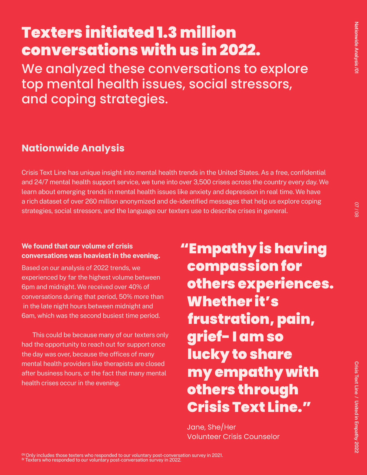 How We Serve: Crisis Text Line provides free, 24/7, confidential mental health support via text, delivering crisis intervention and prevention when it’s needed most. We pair human connection with scalable technology, research, and partnerships to strengthen mental health systems and drive lasting change.
