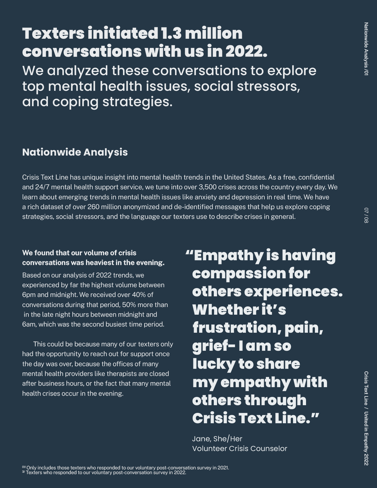 Crisis Text Line’s compassionate volunteer community is at the heart of everything we do. Each volunteer is trained to listen with empathy and respond without judgment, creating a safe, supportive space for people in crisis or in need of emotional help. We take pride in our human-to-human connection—offering hope, understanding, and a sense of belonging to those who need it most. Available 24/7, this dedicated community helps texters feel less alone during their most difficult moments. To date, we’ve built one of the largest mental health crisis response training programs in the world, training over 120,000 volunteers.