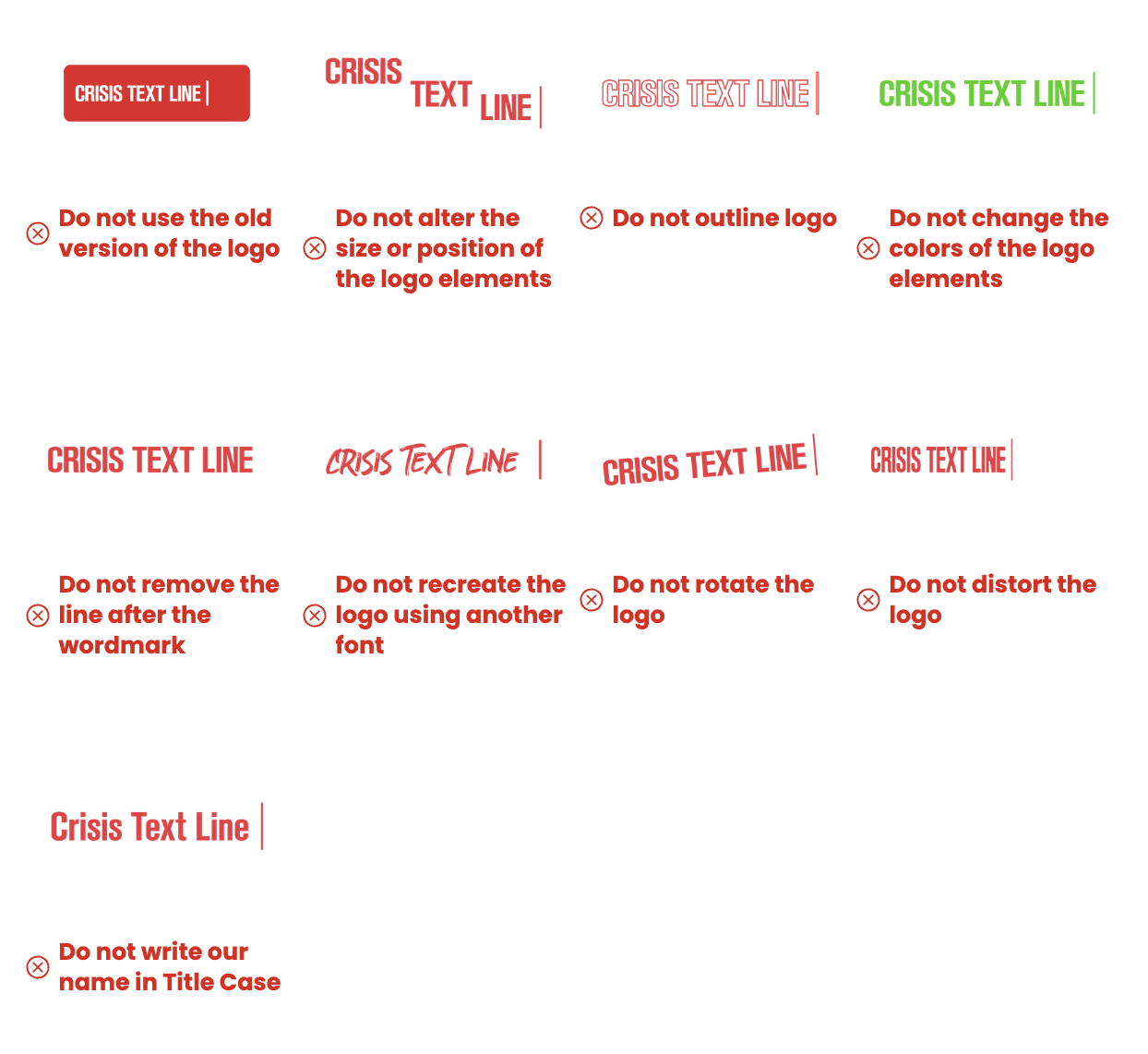 Use the logo to imply a sponsorship or strategic partnership with Crisis Text Line unless approved by Crisis Text Line’s Creative Director.